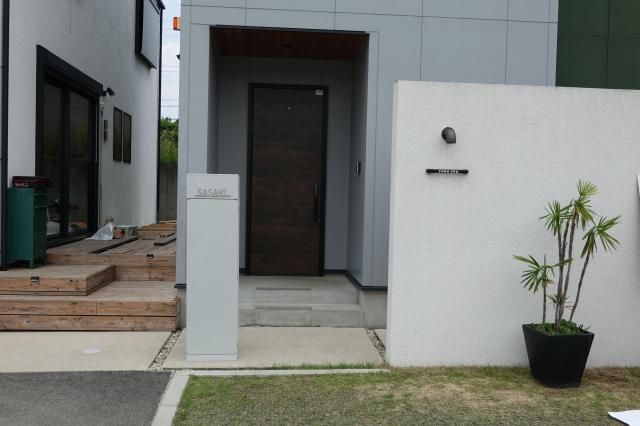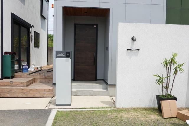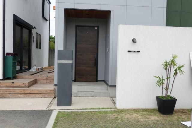 正四角形を基調としたシンプルなデザイン。生活感の出やすいポストや宅配ボックスは側面にすっきりと収めることで、正面から見た景観はどこまでもスタイリッシュに。正面には、表札やインターホン(別売り)を取り付ける事が可能。
