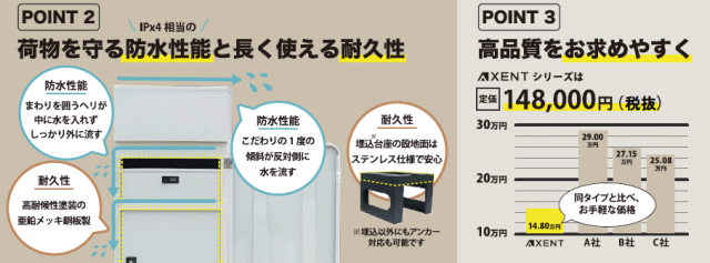 POINT2 荷物を守るIPx4相当の防水性能と長く使える耐久性。